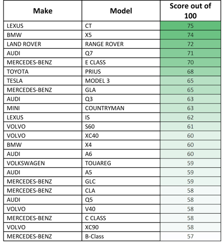 Topping the index was the Lexus CT, closely followed by the BMW X5 and Range Rover. In August the demand for low or zero-emission cars also rose with both Tesla Model 3 and Toyota Prius featuring for the first time in the index alongside the hybrid Lexus CT and IS.