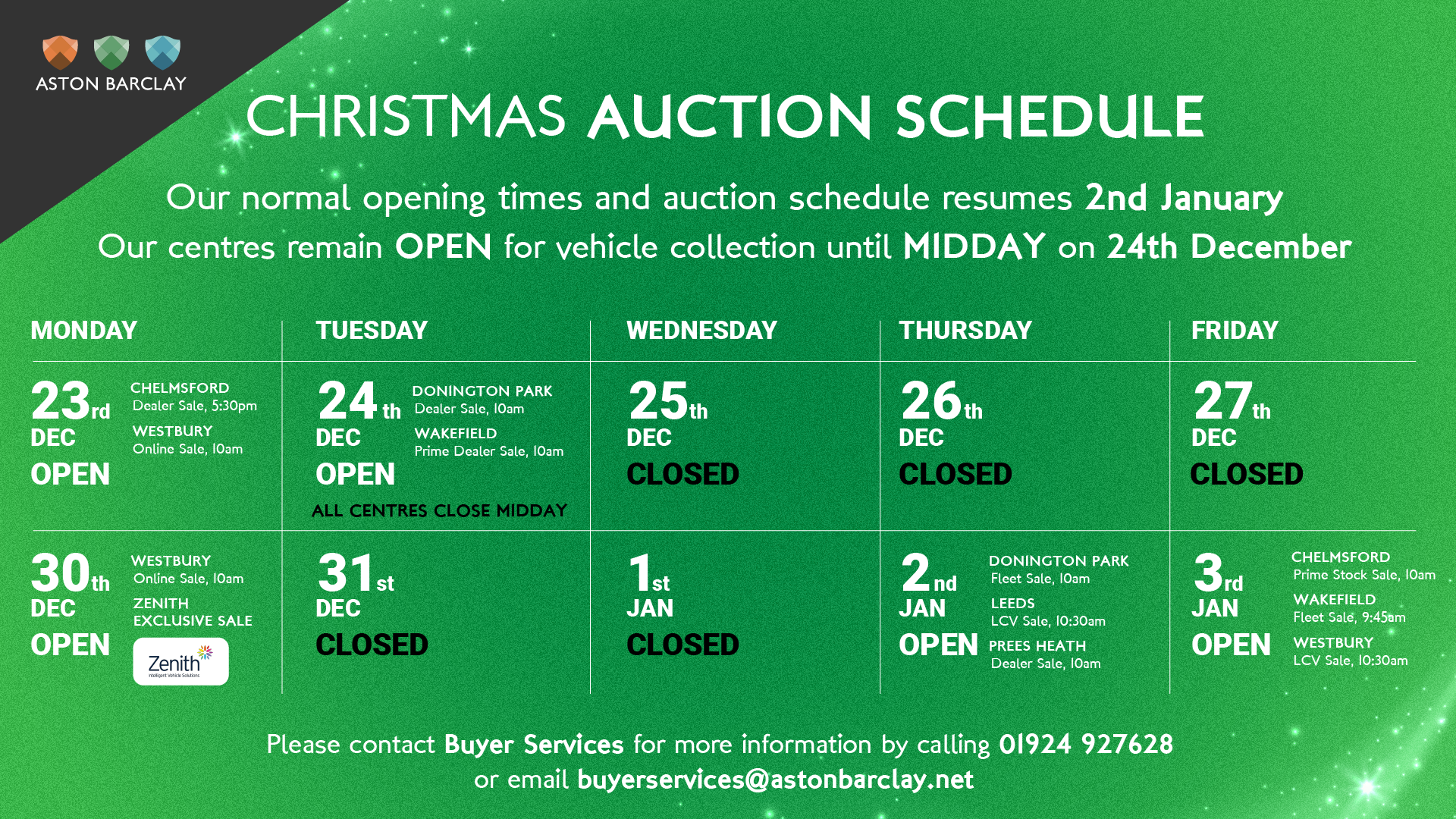 Our centres will be closed from Midday on Tuesday 24th December, with our normal opening times and auction schedule resuming from Thursday 2nd January 2025.